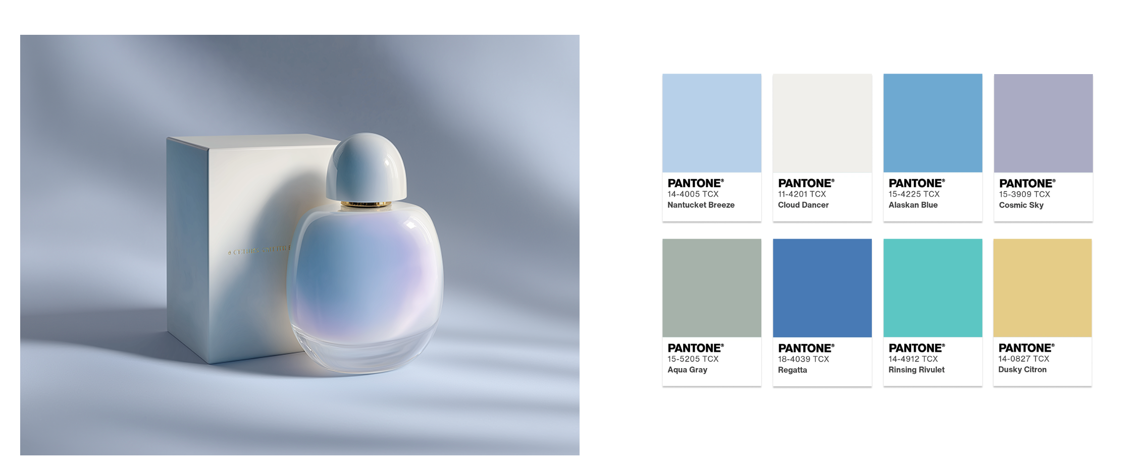 Invites us to breathe in a serene mix of blues, aqua grays and dusky hues that echo sky and sea, pairing beautifully with Cloud Dancer’s airy base.
