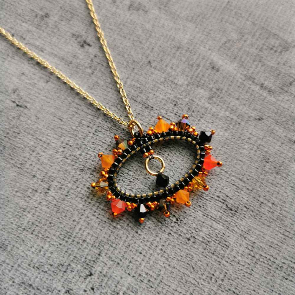 Fun to make and so cute! This pendant made with brick stitch around a frame connector doesn't have to be spooky, but it an be is you use pumpkin colors, black and purples or Disney-villain green!