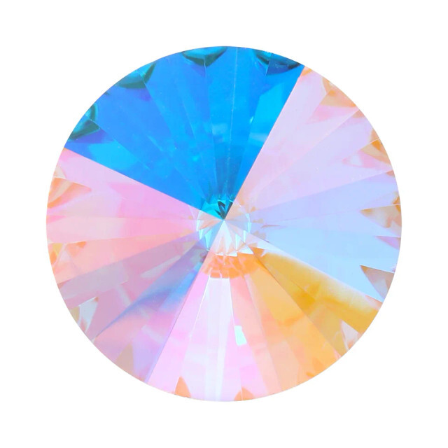 You receive 8 chatons, representing all four colors of our Krakovski Glitter line in 8mm: Light Rose, Light Sapphire, Aquamarine, and Lavender. The effect is a rainbow gradient of glitter that vibrates with joy. Then come the showstoppers: 4 Krakovski Rivoli stones in the brand-new Aquamarine Transmission finish. Transmission is like AB’s more flamboyant cousin—warmer, richer, and bursting with pinks, oranges, yellows, and teals. These stones are mesmerizing in person and even more spectacular once bezeled.