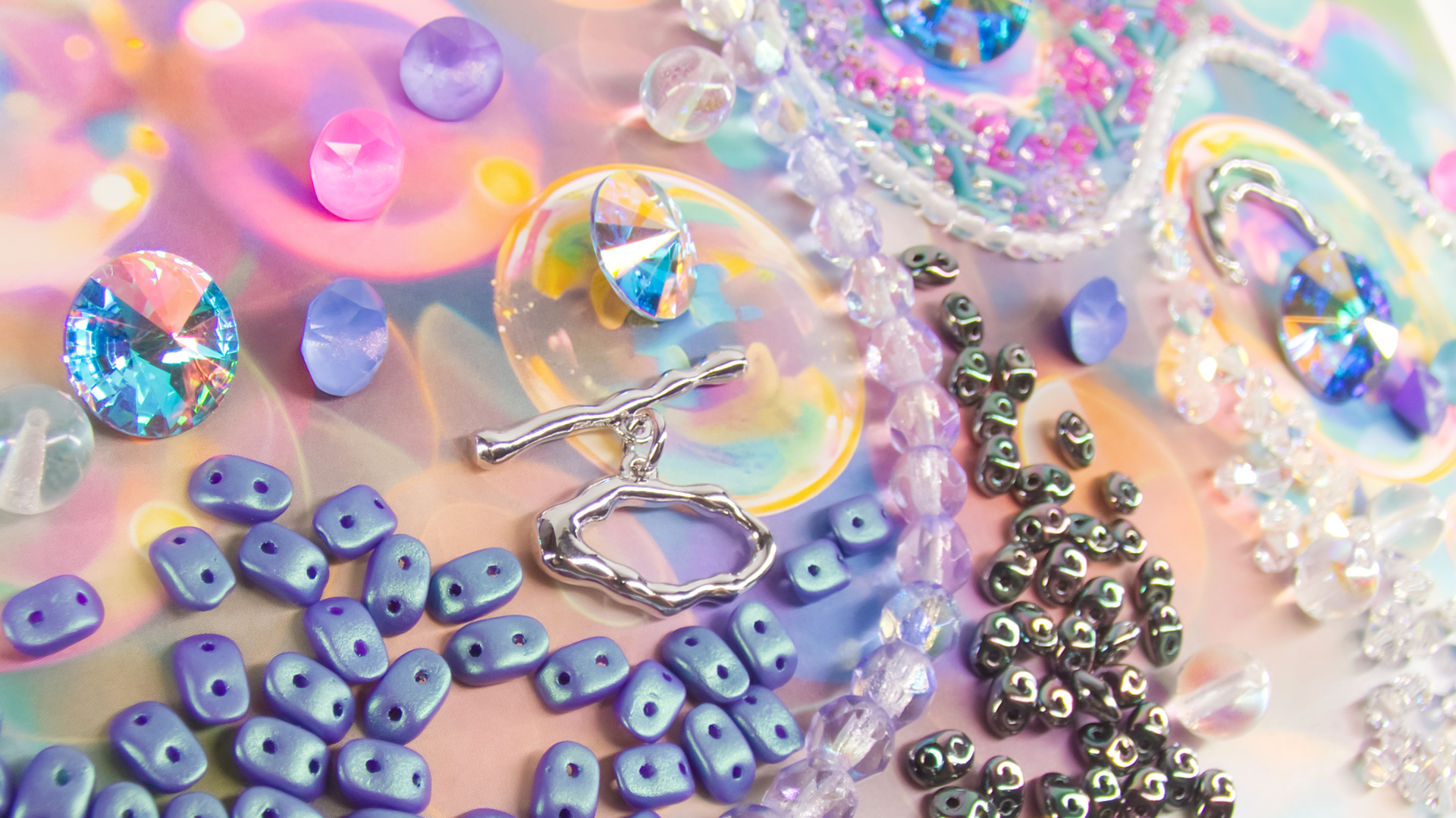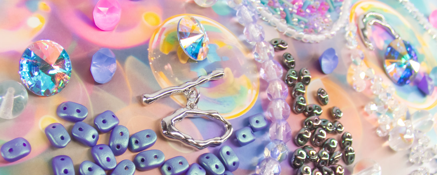 From the rainbow-lit seed bead mix to transparent bubble-like druks, glittering chatons, Transmission-coated Rivolis, and softly gleaming white gold findings, The Bubblescence Collection LITE brings together every shade of mermaid, unicorn, and iridescent dream. With pinks, purples, lavenders, blues, and teals shifting in and out like a bubble’s fleeting colors, this palette invites play, experimentation, and joy. Whether you lean toward ethereal earrings or full-sparkle statement pieces, the possibilities are endless, and delightfully sparkly.